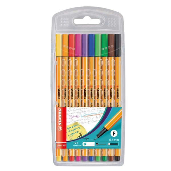 • Astuccio 10 colori. Punta in feltro con rinforzo in metallo per garantire una grande resistenza. Cappuccio ventilato antisoffocamento. Lunga durata anche senza cappuccio. Ideale per lavori con riga , fotocopie e stancils. Tratto da 0,4mm.